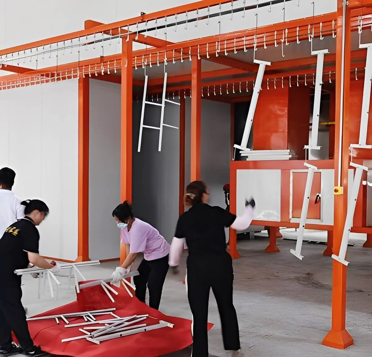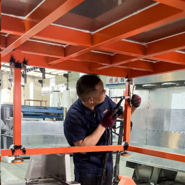 Electrostatic Powder Coating Electrostatic spraying is the core part of thepowder coating line. In this process, the powder coating is fed into the spray gun,which generates high voltage static electricity through an electrostatic generator.When the powder coating passes through the gun, ittakes on an electrical charge.Since the workpiece is grounded, the charged powder coating is uniformly adsorbedon the surface of the workpiece under the action of electrostatic gravity.